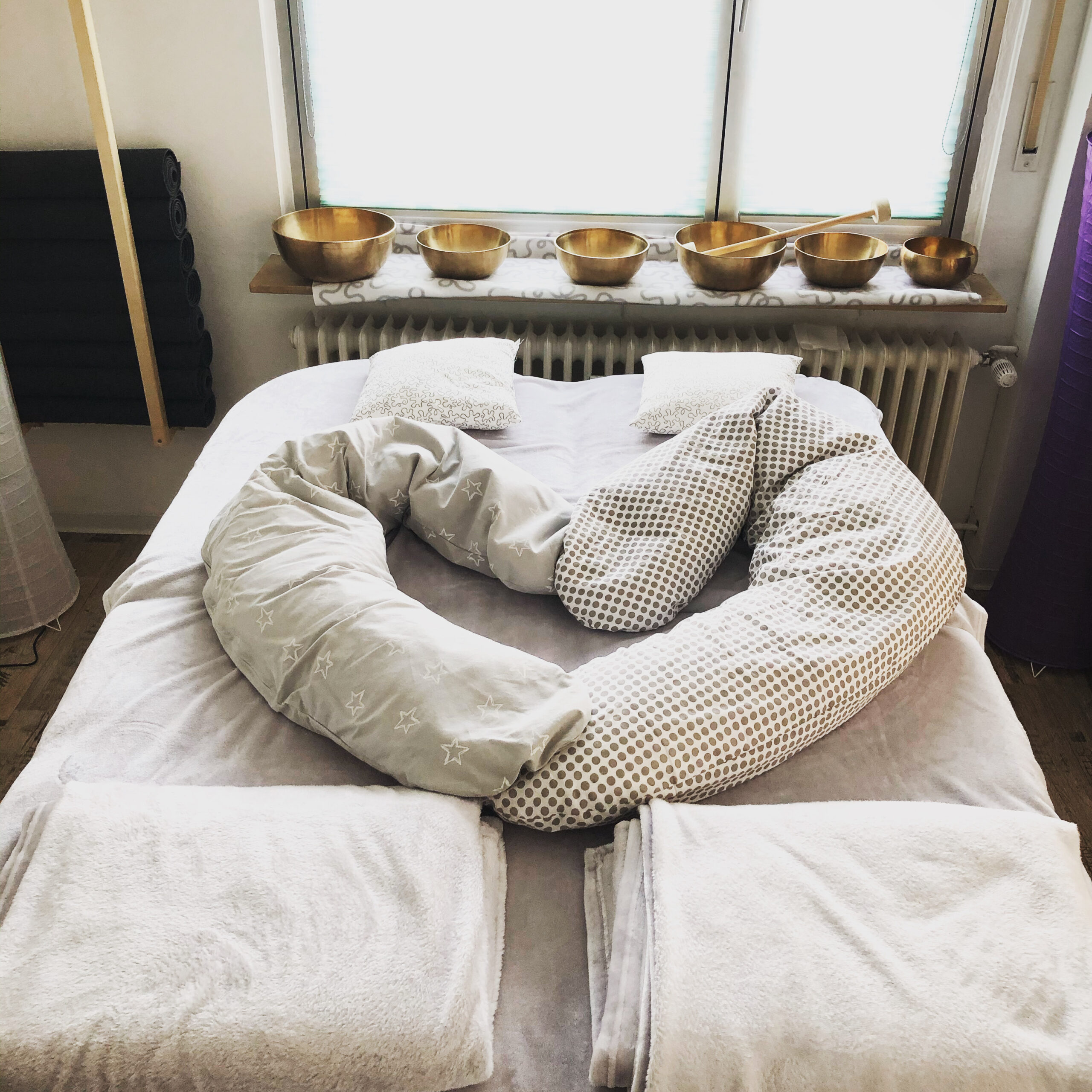 Zwei Liegen hatte ich vorbereitet, Decken und Kissen waren dekorativ arrangiert, die Klangschalen in zweifacher Ausführung standen ordentlich bereit, der extra lange Schlägel wartete auf seinen Einsatz – alles wirkte stimmig.